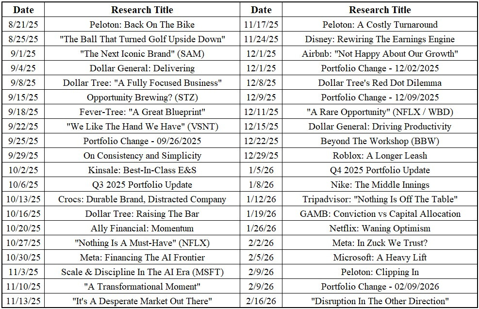To give you a sense for the companies and industries that I follow and own, here’s a list of the research sent to TSOH subscribers over the past six months.