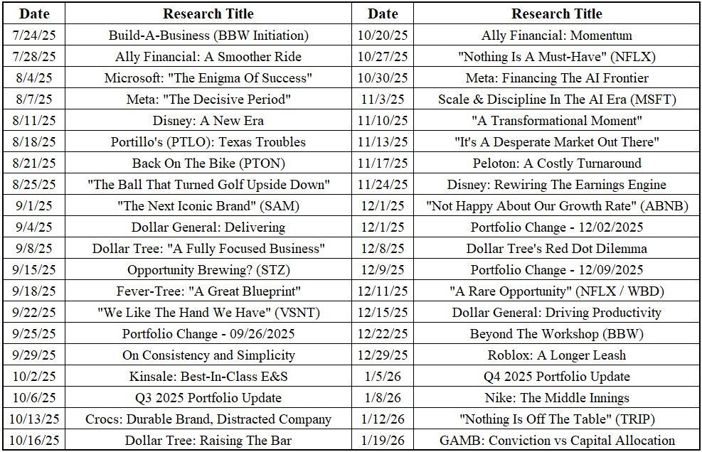 I stated TSOH with a clear objective: to provide professional investors (CIO’s, analysts, etc.) and serious DIY investors with high-quality, long-term focused equity research and 100% transparency. Subscribers have full access to timely equity research (published every Monday and every other Thursday), prior disclosure before all portfolio changes, and ongoing performance tracking / quarterly updates. (The portfolio disclosed to subscribers accounts for 100% of my family’s investable assets, outside of cash in checking for living expenses).