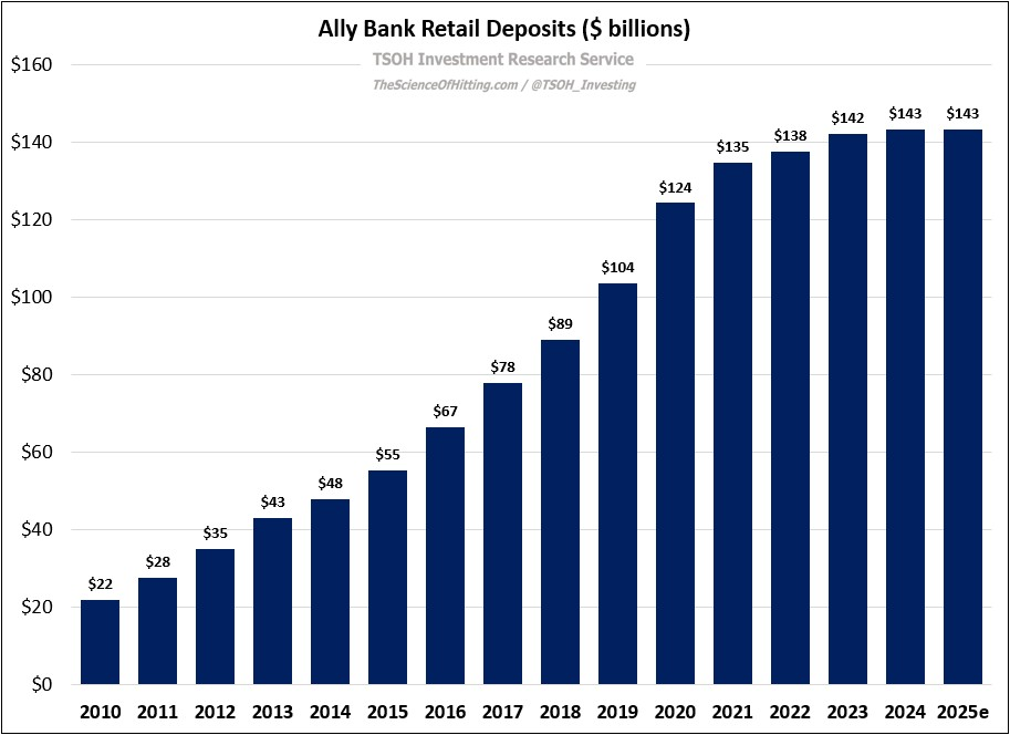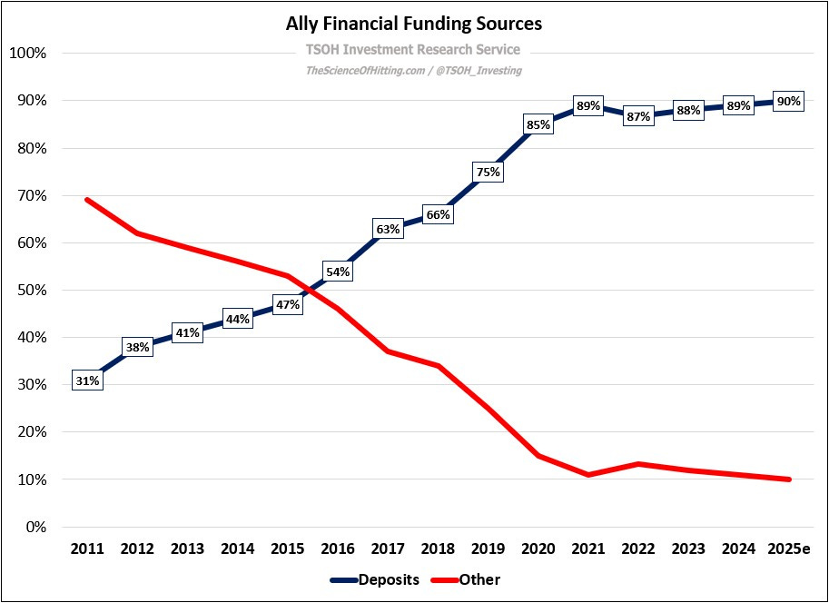 From “Ally Financial: Speed Bump” (October 2024): “Now that Ally is being more cautious on retail auto originations, they have some flexibility on how aggressively to chase deposits… Given what’s happening on the asset side of Ally’s balance sheet, they may be more willing to let OSA (retail deposit) pricing widen further from what others pay. In doing so, they can test how different customer segments value / weigh the importance of relative interest rates versus the other considerations that lead them to bank with Ally; I think it is likely that this answer has somewhat changed over the past decade…”