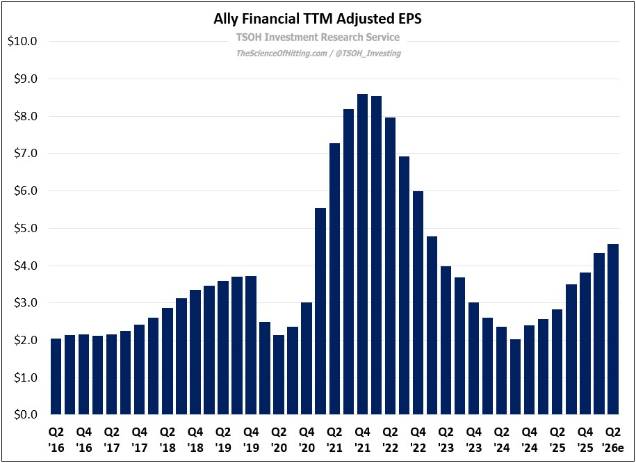 ALLY has seen a solid resurgence of late: the stock is up ~40% over the past year and has doubled since YE 2022 (TSR). This recent price increase has still lagged its strong earnings recovery, with Q1 FY26 TTM adjusted EPS up ~70% to ~$4.3 per share. (On an annual basis, I estimate FY26e EPS at ~$5.3 per share - up ~125% from the FY24 EPS trough of ~$2.4 per share.)