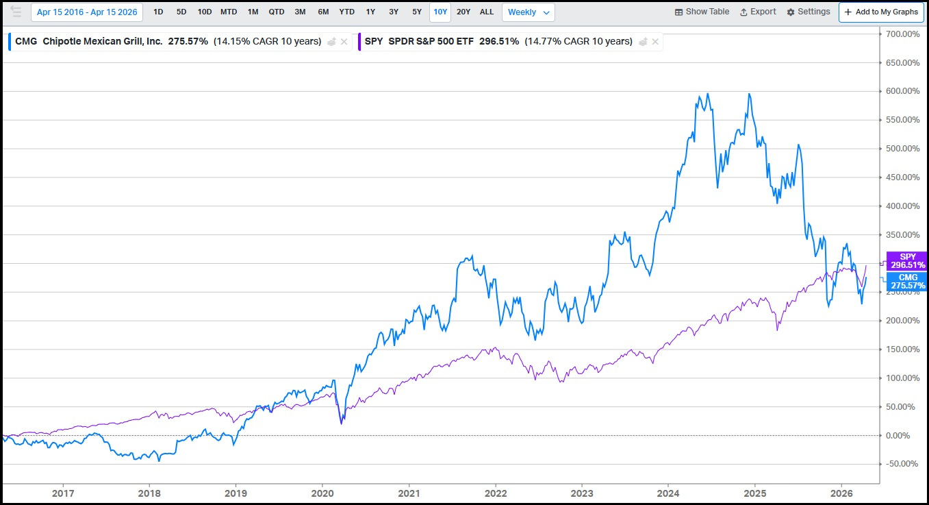 “Chipotle has been a major success story during its 15-year run as a public company. Long-term shareholders who have weathered volatile periods - in terms of the stock price and the business results - have been handsomely rewarded for their patience. If history is any indication, we’ll see another rough stretch at some point; if that happens again, I will be ready to act.”