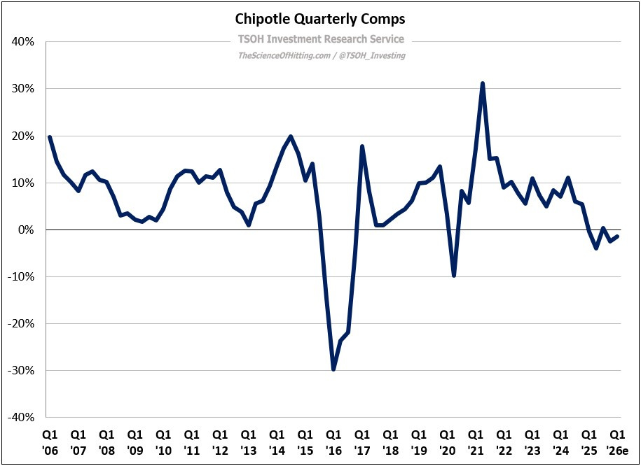 Chipotle reported -1.7% comps in FY25, led by a 2.9% decline in comp transactions; that was inclusive of -2.5% comps in Q4, with transactions -3.2%. Outside of the pandemic and the 2015 / 2016 health safety issues, these are the weakest comps at Chipotle in the past two decades – with guidance (roughly flat comps) assuming similar lackluster results in FY26.