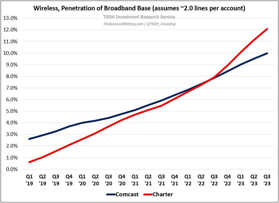 I continue to believe Cable has a compelling opportunity in connectivity, particularly as a result of the perpetual MVNO agreement (as you can see below, wireless penetration is rising quickly at both companies). I’m still convinced Cable remains well positioned to effectively compete through connectivity bundles, which will drive much higher wireless penetration.