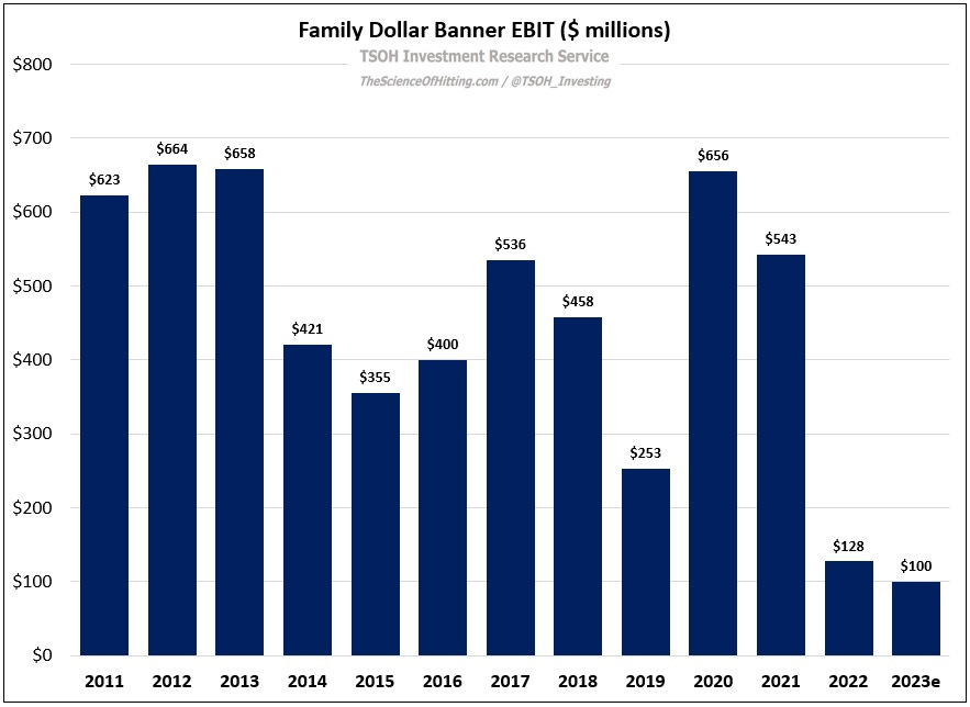 In 2022, Family Dollar generated $128 million in operating income – it’s worst result in more than a decade. In addition, based on management’s commentary on the Q4 call, the banner will likely deliver a roughly similar level of profitability in 2023. As a reminder, the price tag on this deal back in 2015 was nearly $9 billion; needless to say, this has not gone according to plan. (DLTR took ~$3 billion of impairment charges on FDO in 2018 / 2019.)