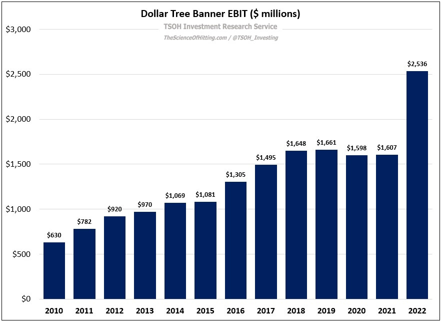 The combination of unit growth (+1% to 8,134 stores), strong comps, and significant margin expansion has led to a major increase in profitability: in 2022, the Dollar Tree banner generated $2.54 billion of operating income – up nearly 60% from 2021. (If we allocate corporate costs on a percentage of revenues basis, banner pre-tax income in 2022 was $2.2 billion; to put that in context, at $149 per share, DLTR has an enterprise value of ~$35 billion.)