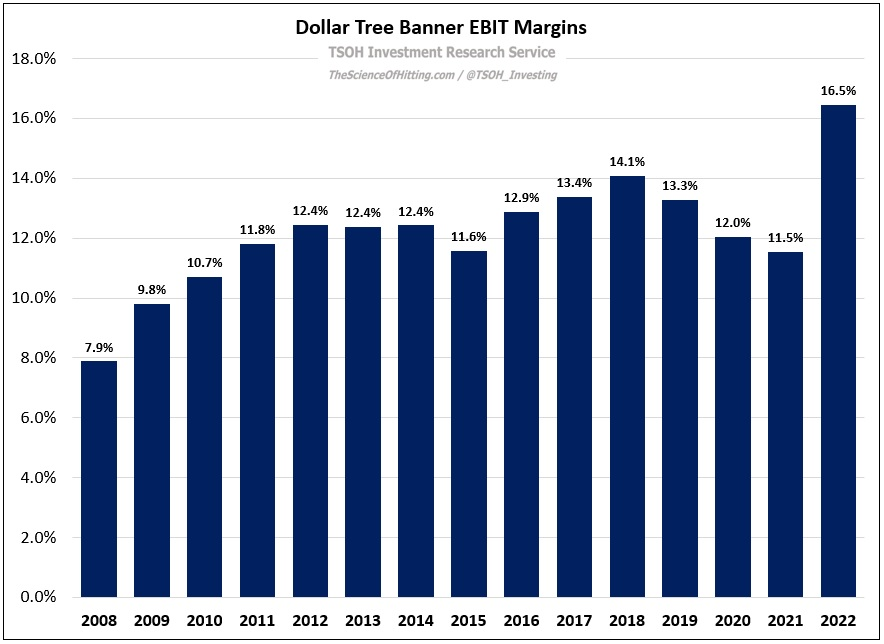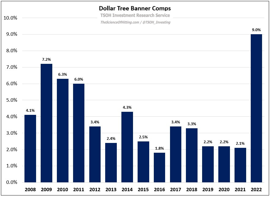 As you can see below, Dollar Tree banner comps increased by 9% in 2022, the strongest print for Dollar Tree in more than 15 years (which includes the financial crisis, a period when its customer value proposition shined).