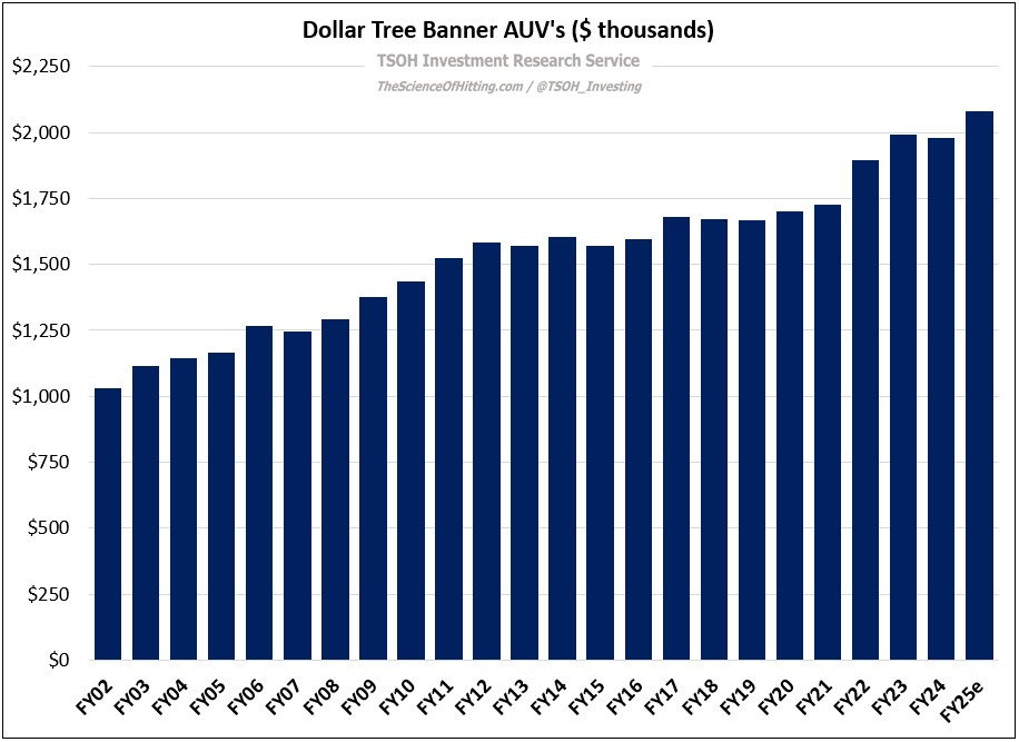 Using same store sales (SSS) as a proxy for customer adoption, we can see that Dollar Tree’s strategic evolution remains on track: FY25e comps / SSS growth is now expected to be north of 5.0%, compared to the initial 3.0% - 5.0% guidance provided in March. As a result, average unit volumes (AUVs) across the banner rose by >20% over the past five years to ~$2.1 million.