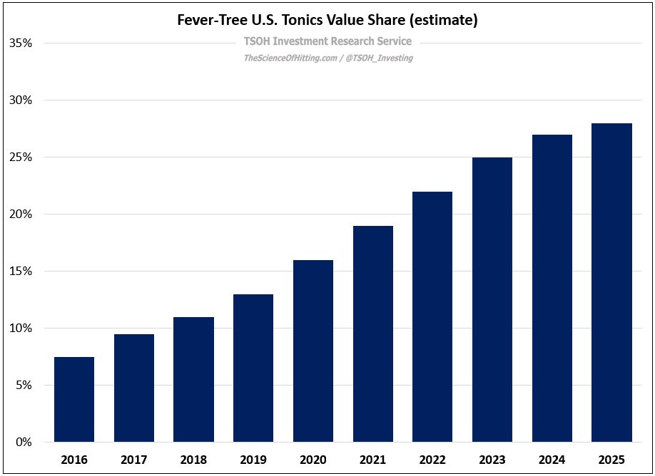 “One has to wonder what the future looks like for smaller competitors, particularly when Fever-Tree / Molson Coors (TAP) accelerate their marketing investments… With a strong and unique brand, leading value share, and an advantaged supply chain / distribution through TAP, Fever-Tree isn’t just a premium tonic / mixer brand; for a large number of consumers, it is becoming the premium tonic / mixer brand. (Optimism here should be tempered given the relatively small size of the U.S. mixers market; to sustain strong U.S. growth rates over the next 10+ years, Fever-Tree must win beyond tonics.)”