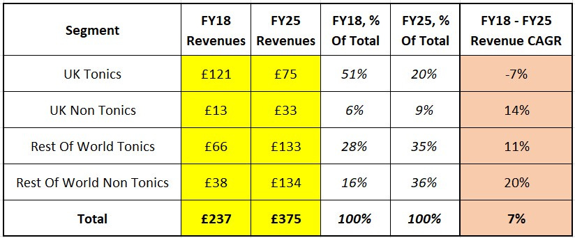 The good news is UK Tonics have since shrunk to just ~20% of Fever-Tree’s revenue base. (In FY25, UK Tonics revenues declined ~6%, with UK Non-Tonics up ~6%.) The rest of the pie is a ~£300 million business that grew revenues at a mid-teens annualized clip over the past seven years, primarily due to the expansion of the non-Tonics range – starting with gingers, then followed by premium sodas / soft drinks, cocktail mixers, and non-alc RTD’s.