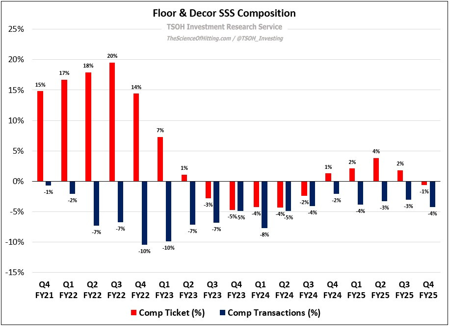 Floor & Decor’s Q4 FY25 results provided additional support for the cautious stance I’ve taken on the business, and particularly the stock, over the past three years. One metric that encapsulates this is comp transactions (traffic), which have contracted at FND in 17 consecutive quarters (-4% in Q4 FY25).