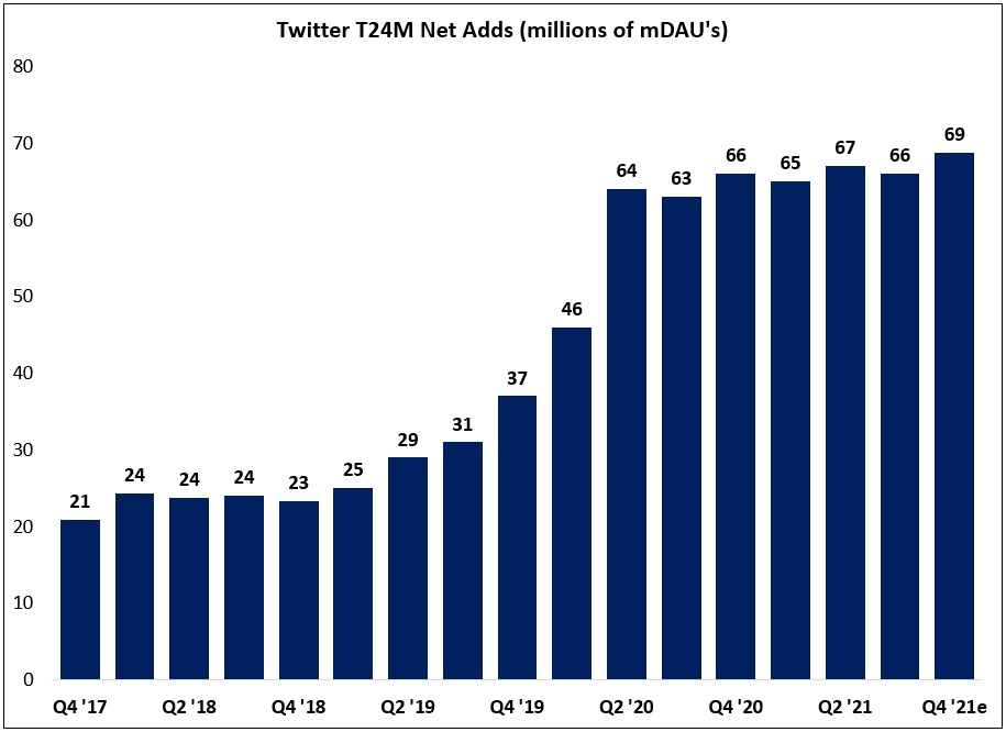Second, that “audacious goal” (at least 315 million monetizable daily active users, or mDAU’s, by yearend FY23), has become an even tougher hill to climb. Based on guidance, the company is likely to end FY21 with roughly 221 million mDAU’s; if so, they’ll need to add 94 million mDAU’s over the next 24 months to reach their FY23 target. As shown below, the pace of trailing 24-month (T24M) net mDAU’s has held in the mid-60’s (millions) over the past six quarters, with help from the surge in engagement throughout 2020 as a result of the pandemic. In order to reach the FY23 target, the pace of T24M net adds will need to climb another ~40% in the face of much tougher comps as the strong FY20 net adds roll off. Simply put, based on current trends, I don’t think there’s reason to believe Twitter will come close to reaching the mDAU target (more on this in a moment).