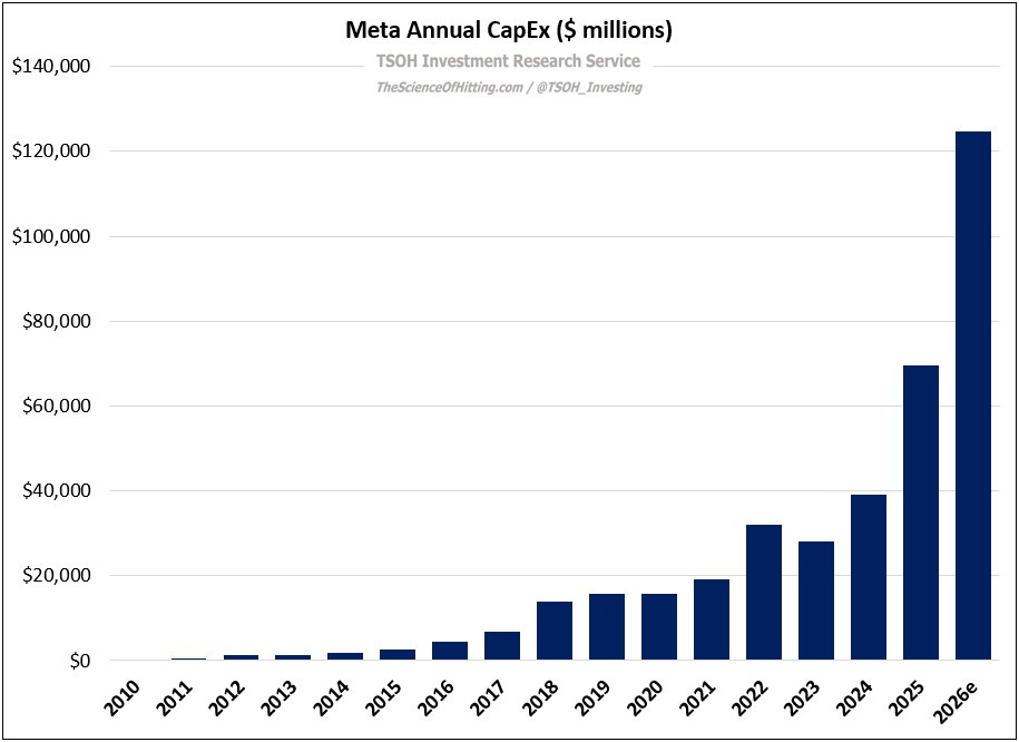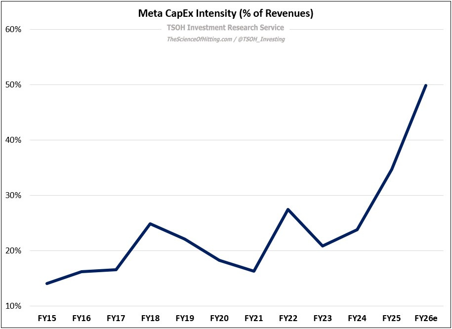 While the initial CapEx ramp referenced in 2022 has clearly worked, Meta has moved to a second investment phase, the scale and duration of which requires an even higher level of trust. With Meta’s latest results, each of these variables – the level of CapEx / expense growth and the corresponding reacceleration in revenue growth – have climbed further into what once seemed unimaginable territory. First is FY26e CapEx: as opposed to the consensus analyst estimates in early 2024 - just 24 months ago - for the coming fiscal year of less than $50 billion, the midpoint of management’s guidance is ~$125 billion, or CapEx intensity of ~50% (on FY26e revenues).