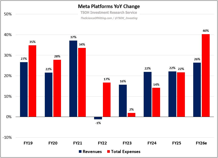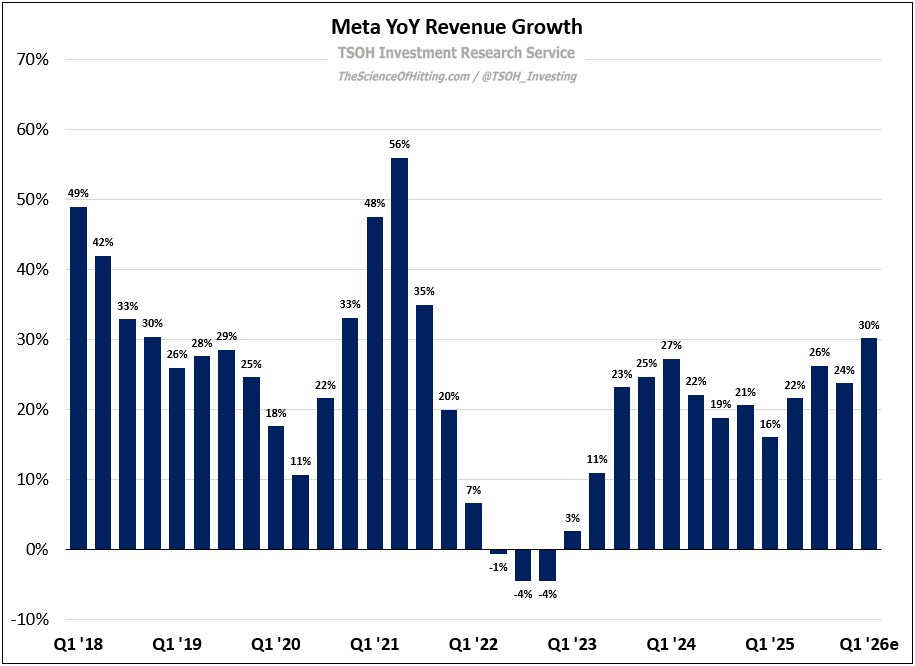 While those figures are staggering, they are one side of the equation. One variable to measure them relative to is revenues – and as you can see below, Meta management expects an equally astounding top-line acceleration in Q1 FY26, with revenues increasing ~30% YoY (+26% CC) at the midpoint - the highest quarterly YoY revenue growth rate from Meta in more than four years.