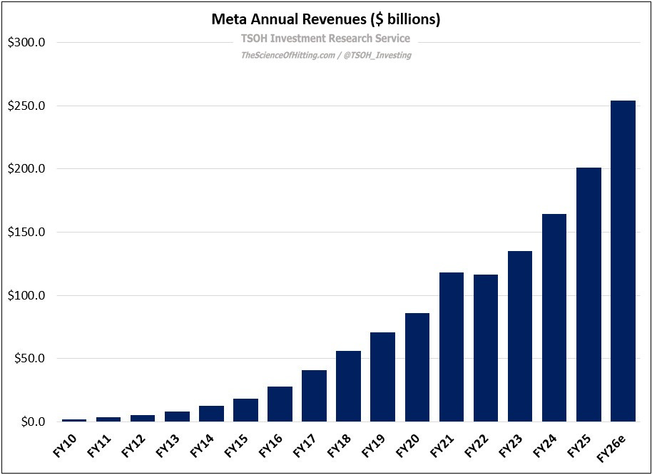 The low end of those expectations - for minimal EBIT growth in FY26e – implies at least mid-20’s (%) revenue growth, to >$250 billion. As we think about how Meta was perceived by the investment community just a few years ago – Facebook was well past its prime, TikTok was disrupting Instagram, and Apple’s policy changes (ATT) would structurally impair targeting and attribution for monetization – it is pretty astounding that Meta has delivered ~22% annualized revenue growth over the past four years (FY22 – FY26e).