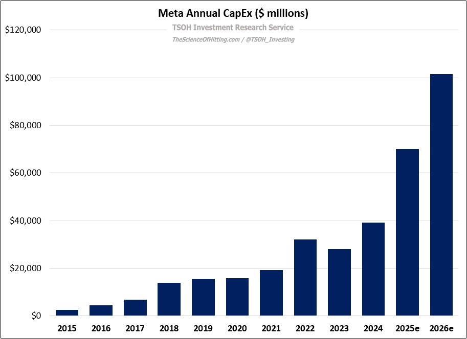 When Meta reported Q2 FY25 results last week, the press release included the following update on FY25 CapEx: “We expect 2025 capital expenditures, including principal payments on finance leases, to be in the range of $66 billion - $72 billion, up ~$30 billion YoY.” In addition, the release discussed early expectations for FY26: “We currently expect another year of similarly significant CapEx dollar growth as we continue aggressively pursuing opportunities to bring additional capacity online to meet the needs of our artificial intelligence (AI) efforts and business operations.” In total, that puts FY26e CapEx at ~$100 billion; for some context on how far we’ve come, the consensus FY26e estimate in Feb 2024 - 18 months ago - was <$50 billion.