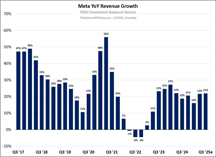 And yet, Mr. Market responded positively to the quarter, sending the stock up >10%. The reason why is because this input - explosive CapEx growth – is just one part of the story. As we look at the output – Meta’s recent financial results – we can clearly see that the first phase of this CapEx ramp has been a home run. As I wrote back in November 2022, when Meta’s FOA CapEx ramp was well underway, we could roughly gauge what would be required to generate a sufficient ROI on the incremental spend (“at least 500 basis points of FOA revenue growth above baseline expectations”). While it’s tricky to pinpoint what “baseline expectations” should be, the number that I had in my head at that time was roughly 10% YoY revenue growth; as shown below, the top-line growth rates Meta has reported as of late have cleared that bar by a wide margin, coming in at +20% or better in eight of the past nine quarters.