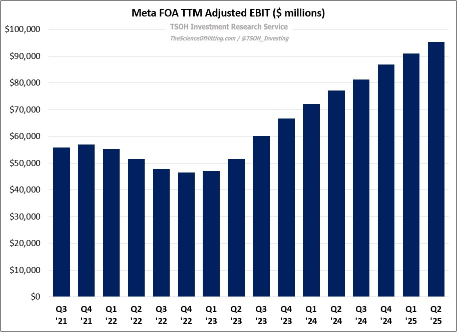 Along with continued daily active people (DAP) growth - up ~6% YoY to ~3.48 billion de-duplicated DAU’s across the apps - the business is benefiting from higher engagement / time spent and improved ad effectiveness (ROAS). As management has consistently quantified on the past few calls, these metrics were directly impacted by the first phase of the CapEx ramp, the spending that Mr. Market originally viewed with skepticism. Stated directly, Zuck’s early CapEx bet on GPU’s paid substantial dividends, which has driven TTM FOA EBIT to ~$95 billion – a cumulative increase of >80% versus 24 months ago.