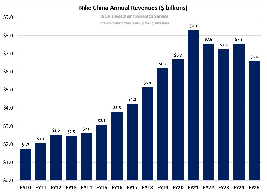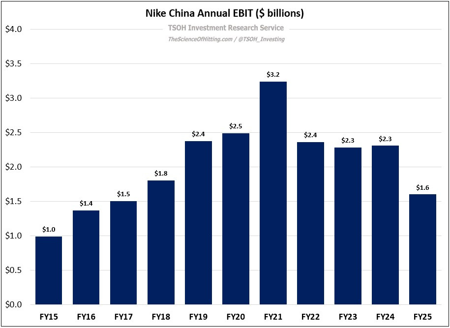 In subsequent updates, I provided additional data to frame Nike’s evolving competitive position in China relative to brands like ANTA and Li-Ning. These concerns are now front and center, with meaningful implications for the financials: as shown below, Nike China revenues were ~$6.6 billion in FY25, down ~21% from the FY21 highs; the impact to profitability has been even more significant, with operating income down ~50% over the same period.