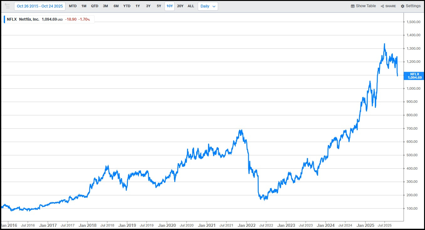 This success, the result of a focused long-term strategic vision and effective execution, has been met with applause by Mr. Market: even after last week’s ~10% decline, to ~$1,095 per share, NFLX is up ~6x from the 2022 lows; it has an enterprise value (EV) of ~$480 billion and trades at ~35x EV/EBIT.