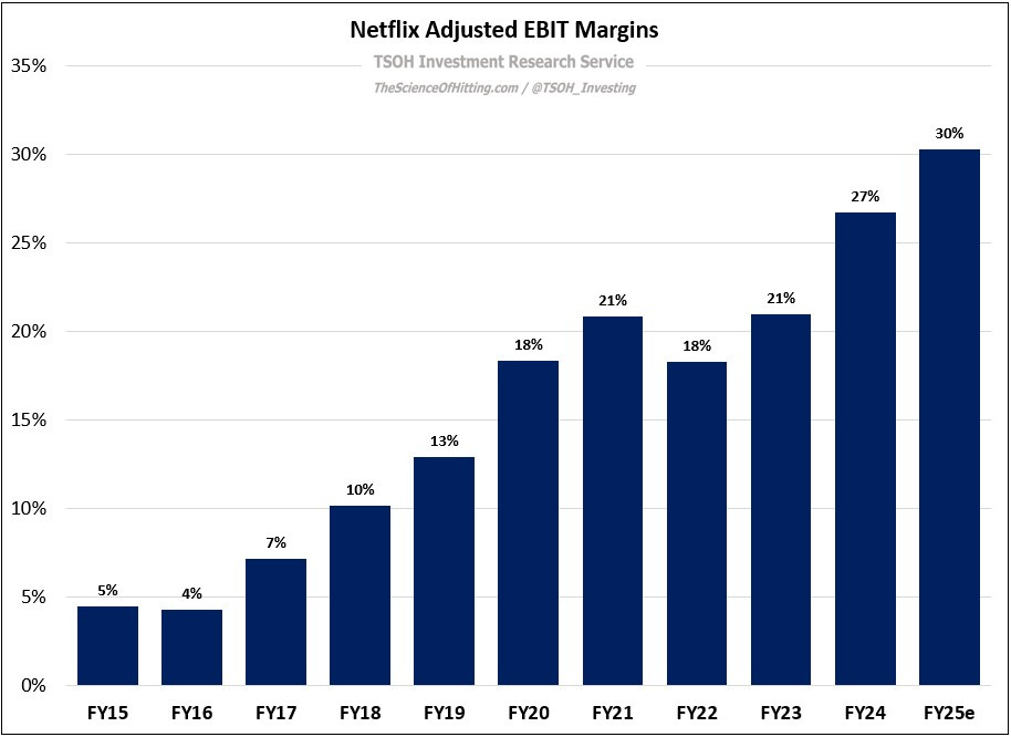 From a financial perspective, FY25 will be another stellar year for Netflix: revenues are set to climb ~16%, to ~$45.1 billion, with adjusted EBIT climbing ~31% to ~$13.7 billion (FY25 will be the third consecutive year with incremental operating margins above 50%). The company has relentlessly pursued global scale for 15+ years, while making key adjustments along the way in support of their two religions. Today’s financial success is a testament to building a best-in-class streaming platform, with an unrivaled breadth of content, to serve a global base of more than 300 million paid subscribers.