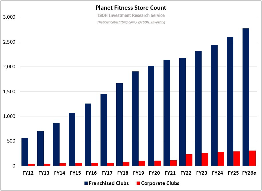 Long before its ascent to a national brand, Planet Fitness (PLNT) started as a single gym in Dover, New Hampshire; over the next 35 years, it became one of the largest operators of fitness clubs / gyms in the world, with ~95% of its ~2,900 stores located in the U.S. and Canada. As you can see below, this is primarily a franchisee model, consisting of ~2,600 stores owned by just 86 different franchisee groups. Note that the number of franchisee groups Planet Fitness works with has contracted by >50% over the past decade (nearly half of these franchisee partners own 10+ stores, with the largest at >200 stores).