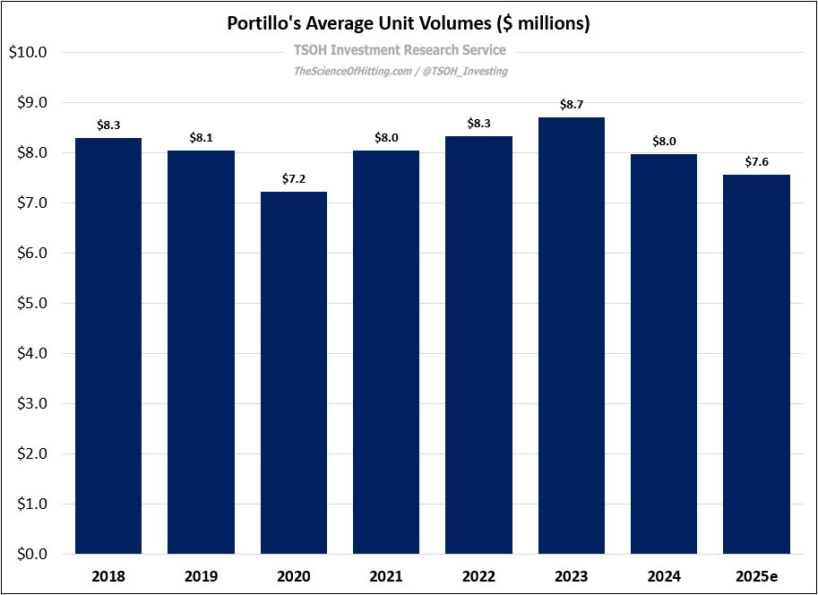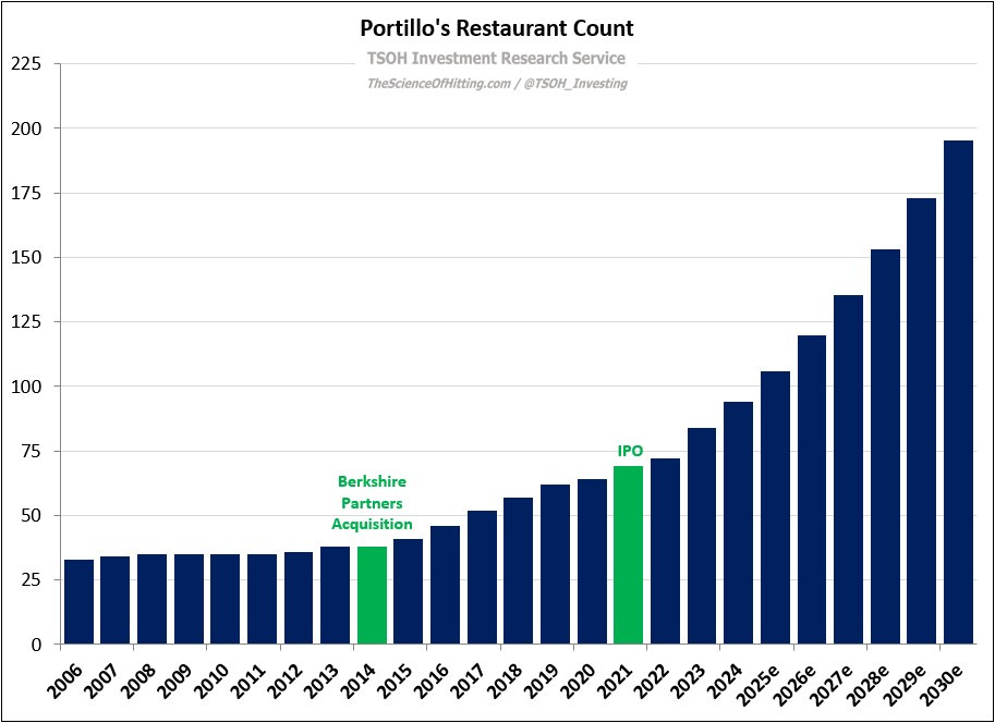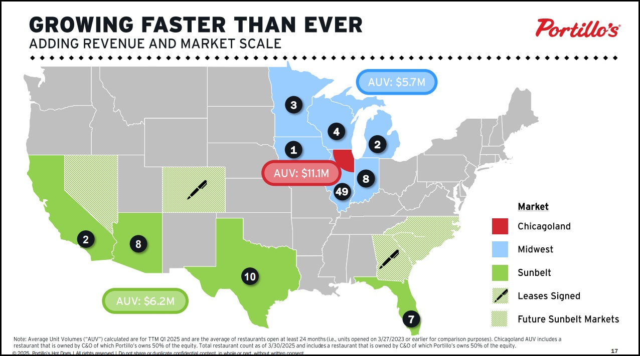 Following the success of The Colony, management set out to ramp new unit growth throughout Texas. The company ended 2024 with 10 units in the state, primarily in the Dallas-Fort Worth (DFW) market; including locations that are set to open this year, the company is on pace for 16 Texas restaurants at the end of 2025, accounting for ~15% of its total units. (Portillo’s home state of Illinois remains its largest by far, accounting for roughly 50% of the unit mix.)