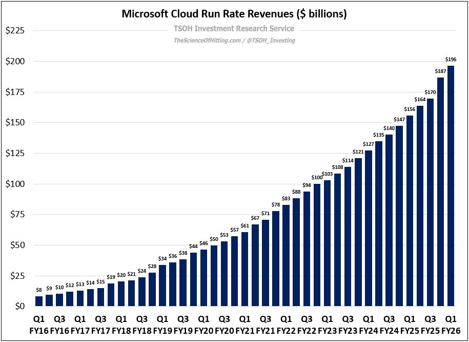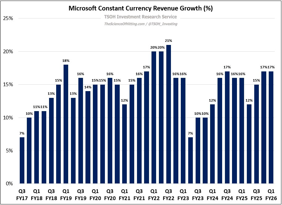 A year later, and another inning into the AI era, I think that framing remains valid. With ~17% constant currency revenue growth in Q1 FY26, a result that extended Microsoft’s streak of double digit YoY growth to 33 of the past 34 quarters (nearly nine years running), we’re seeing continued evidence of its competitive strengths and its long-term incremental growth opportunities.