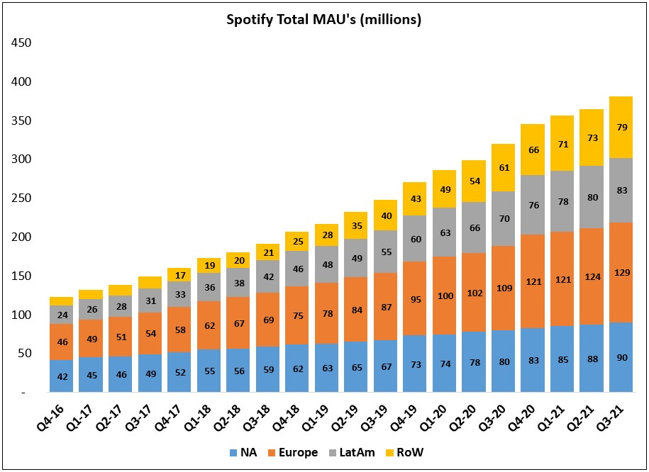 Following a difficult start to the year, with lackluster MAU additions in both Q1 and Q2, Spotify’s growth algorithm got back on track over the past 90 days. As shown below, the company ended Q3 with more than 380 million global users, with forward guidance suggesting Spotify will end 2021 with more than 400 million MAU’s around the world (at the end of Q3, SPOT had 172 million premium subscribers, with an average ARPU of €4.34 per month).