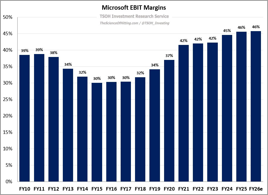 Microsoft’s FY25 results, with revenues, EBIT, and EPS increasing at a mid-teens YoY rate, highlight two key points on the long-term MSFT investment thesis: (1) despite its massive size, with revenues set to cross $300 billion in FY26, this business can still generate double digit top-line growth; and (2) despite huge investments to support that ongoing growth, the company has been able to drive efficiencies that allow for as good, or better, profit growth.