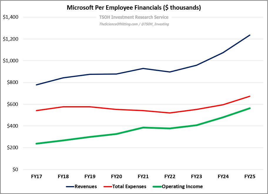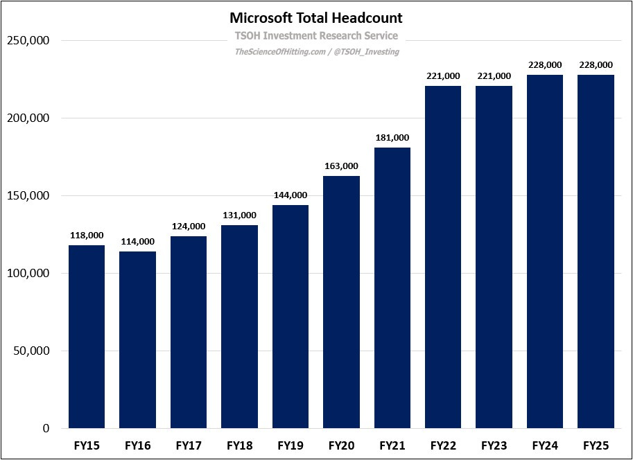 A part of the story that doesn’t receive as much attention is the company’s drive for incremental operating efficiencies. One notable example is on headcount: the ~15% YoY revenue growth that Microsoft reported in FY25 came despite no material change to its total headcount. (You can see in the second chart that EBIT per employee is up ~40% over the past two years.)