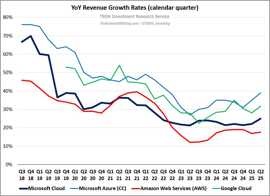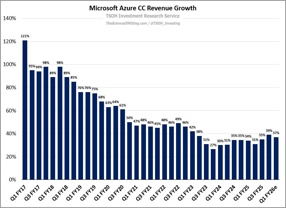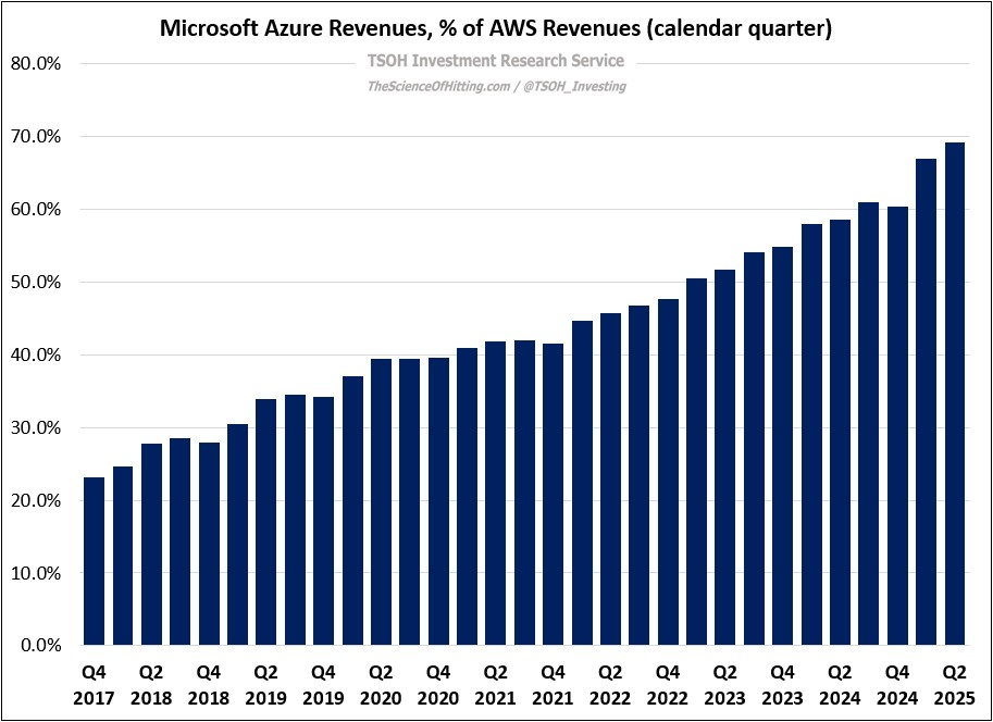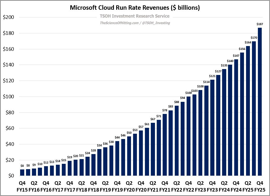 The star of the show continues to be Microsoft Cloud. As a reminder, financial targets for this business were first set a decade ago, at an investor event in April 2015. Management’s initial objective - $20 billion in run rate revenues by the end of FY18 - was cleared by a wide margin, and the business has kept galloping forward ever since: Microsoft Cloud exited FY25 with run rate revenues of $187 billion, and with a +27% trailing five-year revenue CAGR.