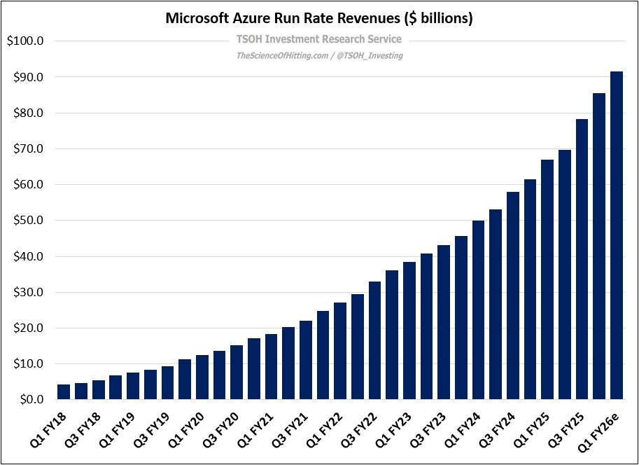 A cornerstone business in Microsoft Cloud is Azure. As I discussed in “It’s Always About The People” (December 2023), Satya Nadella played a crucial role in the early support of, and ultimately the long-term success of, Azure (originally Red Dog). This quarter, management provided financial disclosures that reveal just how important Azure has become, with FY25 revenues of more than $75 billion (+34% YoY). As you can see below, this implies that Azure run rate revenues will exceed $90 billion next quarter – or ~5x larger than its size five years ago (~$18 billion run rate as of Q1 FY21).