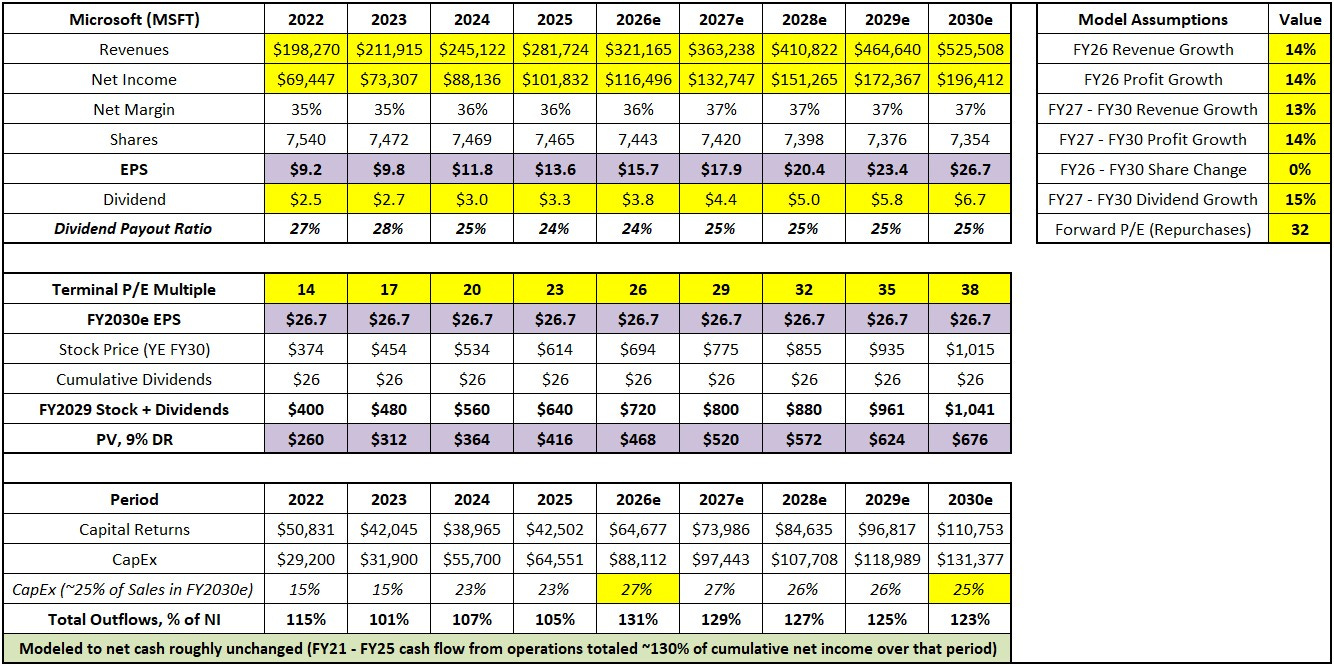 Periodic trimming (in March 2024 and June 2024), along with the tailwind of a solid run for the broader TSOH portfolio, has left MSFT at an ~11% weighting. I think the financial model shown below includes realistic expectations about how Microsoft’s business is likely to perform over the next five years - but it also reveals that the margin for error on the stock has narrowed over time.