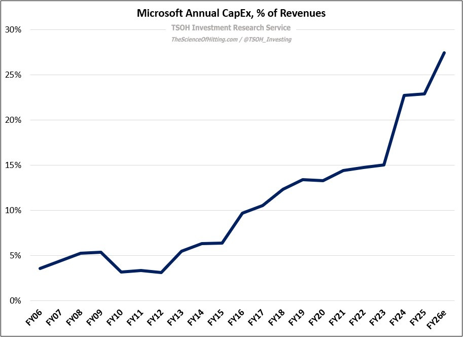 The impressive revenue growth cited above has coincided with even more astounding growth in Microsoft’s capital expenditures. As shown below, I expect that FY26e CapEx will be equal to roughly 27% of the company’s revenues – a level of CapEx intensity that’s ~2x higher than five years ago (in dollars, from ~$24 billion in FY21 CapEx to ~$88 billion in FY26e CapEx).