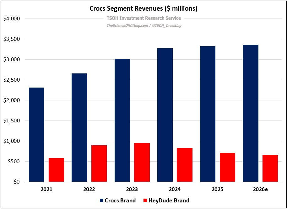 Monday’s post will be an update on Crocs (CROX), a company that I initiated coverage on in October 2025. The shares have struggled of late, with CROX trading at a mid-single digit P/E on FY26e. I’ll dig into recent trends at the namesake brand, along with an update on the HeyDude turnaround efforts.