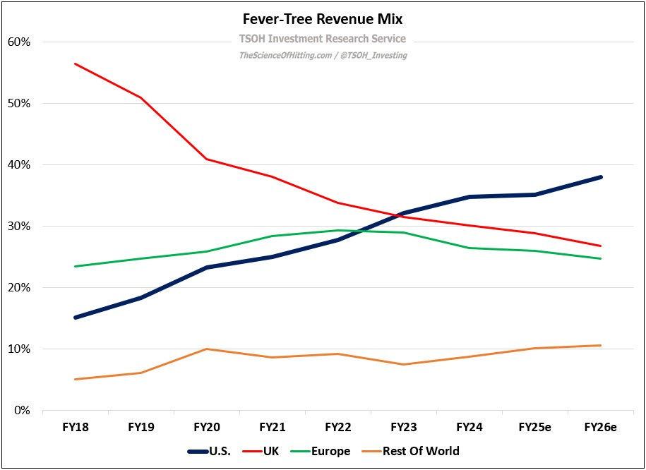 As I discussed on Monday, the transformation of Fever-Tree’s geographic exposure and product mix continued in FY25; it will accelerate further in FY26 as the strategic partnership with Molson Coors transitions to an offensive posture (“roughly doubling” U.S. marketing support). In combination with the meaningful decline in exposure to UK Tonics - now ~20% of Fever-Tree’s business - I believe we’re set to see a meaningful revenue reacceleration.