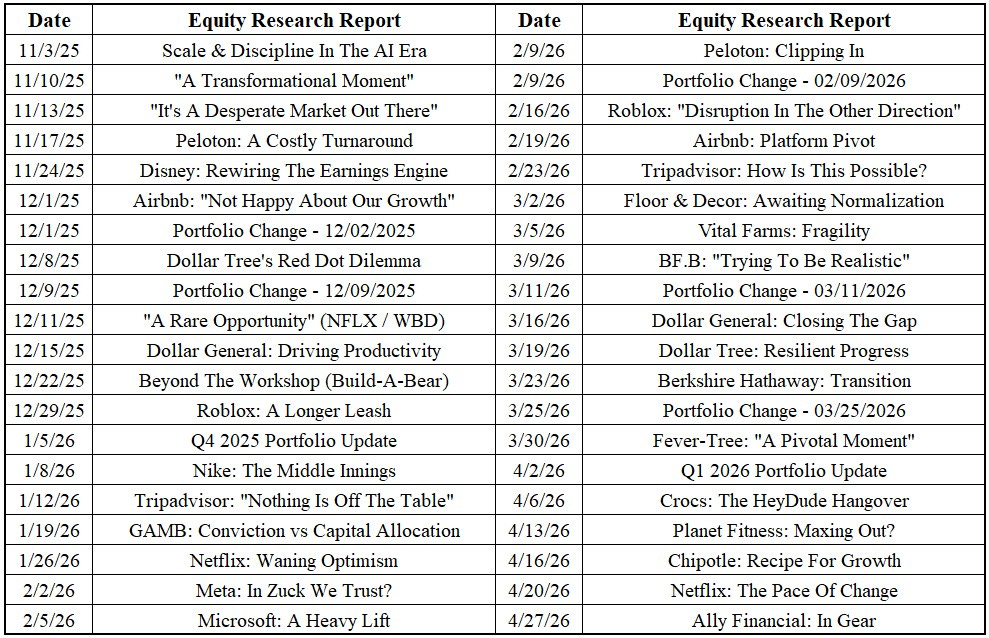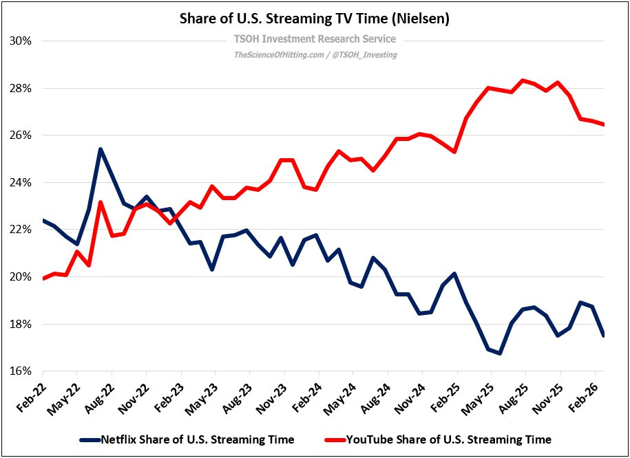 As discussed in Monday’s update, impressive near term financial results have not assuaged Mr. Market’s concerns about Netflix’s exposure to changes in the media / entertainment industry. One data point that encapsulates this concern is Netflix’s declining TV streaming market share (engagement) in the U.S., during a period where YouTube has been trending in the other direction. While there are nuances to appreciate here, this highlights a key concern weighing on the stock, with the EV/EBIT multiple contracting to ~25x forward.